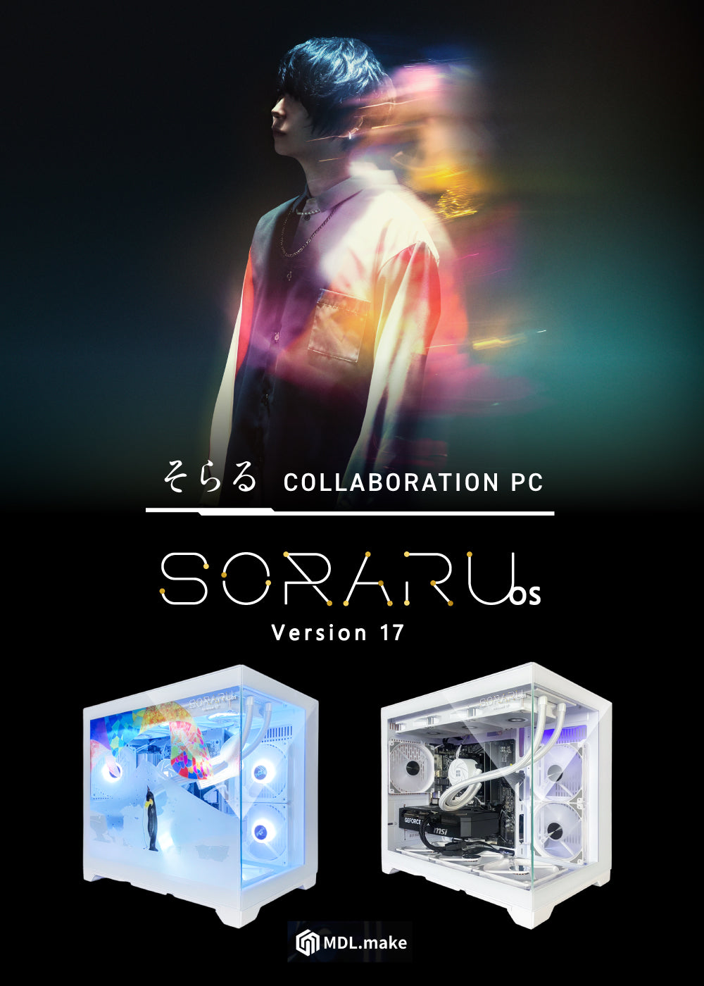 そらる17周年を記念して、アルバム『ユメトキ』に収録されている楽曲「オーロラ」の情景を重ね合わせた特別デザインのコラボモデルPCが登場!空を見上げるペンギンと、ステンドグラスのように色鮮やかな光を放つオーロラが描かれています。